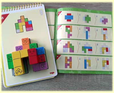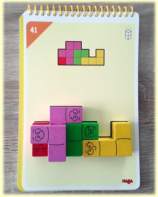 Bei uns hieß dies konkret, dass mit 5 Jahren alle Aufgaben, die nur aus einer Ebene bestanden, auf Anhieb gelöst wurden, was Nummer 1 bis 15 entspricht, welche auch dem niedrigsten Schwierigkeitsgrad zugeordnet werden. Auch die ersten Rätsel aus zwei Ebenen gehören zu dieser Stufe und lassen sich problemlos nachbauen. Das zweite Level beginnt erst bei Nummer 31, wobei es hier erst interessant wurde, da richtig nachgedacht und kombiniert werden musste. Die dritte Ebene und gleichzeitig Schwierigkeitsgrad 3 befindet sich auf den Karten 51 bis 60, die bei uns jedoch nur noch mit Unterstützung durch einen Erwachsenen gelöst werden konnten.