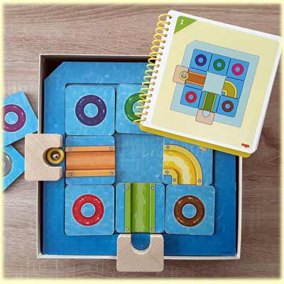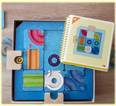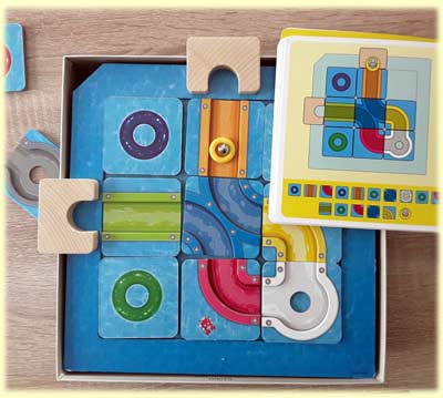 Das Spielprinzip selbst ist dabei ziemlich einfach und lässt sich schnell verstehen. Aus dem Spiralblock wird eine Aufgabe ausgewählt, die abgebildeten Plättchen entsprechend auf den Spielplan gelegt, bevor es dann mit Schieben losgeht. Zum Einstieg ist die Lösung noch sehr einfach, bei der ersten Aufgabe führt beispielsweise ein einziger Zug zum Ziel. Doch schon bei den nächsten Aufgaben steigert sich das Niveau und die Anzahl der Züge schnell, bis schließlich bei den schweren Aufgaben sogar bis zu 28 Züge notwendig sind, was für kleine und große Spieler eine Herausforderung darstellt. Ist eine Aufgabe doch mal zu schwer, lässt sich auf der Rückseite der Lösungsweg einsehen.