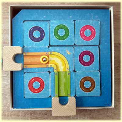 Wer eine noch etwas größere Herausforderung sucht, kann den Ring um die Kugel weglassen, wodurch die Kugel schneller rollt und es schwieriger wird, sie um die Löcher herumzuführen. Erschwert wird das Rollen der Kugel jedoch durch die kleinen Spalten, die sich zwischen den einzelnen Plättchen befinden, sodass die Kugel doch oft hängen bleibt. Auch Start- und Zielblock verrutschen oft, was beim Spielen stört.