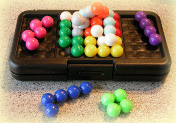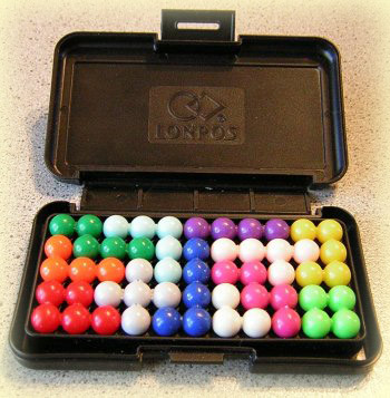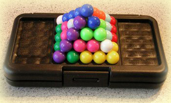 Liebhabern abstrakter Spiele wie Tetris, Ubongo oder Blokus wird das Spielmaterial wohl vertraut vorkommen, da sich die Formen der einzelnen Teile gleichen. Ungewohnt ist lediglich die Kugelstruktur der Puzzleteile, ohne die jedoch auf das dreidimensionale Knobelvergnügen verzichtet werden müsste. Verpackt ist alles in einer robusten Plastikbox in der Größe eines Brillenetuis, was sehr handlich ist. Die Spielfläche im Innern der Box besteht aus 55 Mulden, welche den Spielsteinen einen optimalen Halt bieten. Die gerade nicht benötigte Teile können im Deckel abgelegt werden. Dies erweist sich alles als äußerst praktisch, denn dadurch steht dem Knobelspaß sowohl unterwegs als auch auf dem Sofa nichts im Wege. Auf der Rückseite der Box befindet sich zusätzlich eine 5 x 5-Felder große Spielfläche für das Errichten der Pyramide, welche sich jedoch auch problemlos im Innern aufbauen lässt.