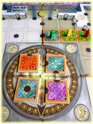 Ist ein Spieler am Zug, dreht er das Rondell so, dass der Pfeil auf ihn zeigt. Danach muss er eines der vier Plättchen platzieren. Dabei ist darauf zu achten, dass die Säulen auf den Plättchen mit jenen auf dem Spielplan übereinstimmen. Außerdem muss er das Plättchen in jenes Palastviertel legen, das vom Rondell vorgegeben wird. Möchte oder kann man das nicht, darf man es auch woanders platzieren. Allerdings muss man dann auf seinem kleinen Vierteltableau den Marker des Zielviertels umdrehen. Dies bedeutet, dass man in dieses Viertel nur dann Plättchen legen darf, wenn dies mit der Rondellvorgabe übereinstimmt.