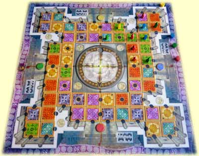 Schließlich kann man auch noch Zusatzpunkte erwerben. Liegen nämlich mehrere gleichfarbige Mosaikplättchen nebeneinander, gibt es für jedes von ihnen einen Extrapunkt. Dasselbe gilt für gleichfarbige Arbeiterketten – auch hier erhält man einen Punkt pro eigener Figur in der Kette.