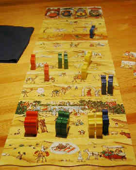Wen das nicht stört, erwartet ein spannendes Wettrennen mit Kamelen auf einem ungewöhnlichen Spielplan.