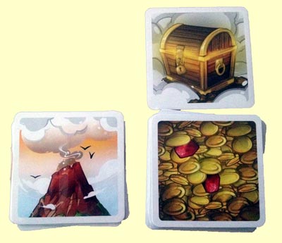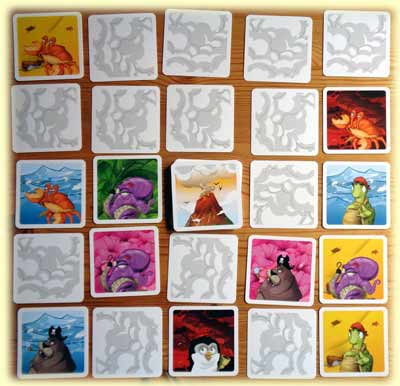 Die 2 - 4 Spieler mischen die 25 quadratischen Karten sorgfältig und bilden anschließend damit eine 5 x 5 große Auslage. Die mittlere Karte wird unbesehen in die Schachtel zurückgelegt. An ihre Stelle kommen 7 verdeckte Schatzkarten, die gleichzeitig auch Rundenanzeiger sind. Darauf wird ein Vulkankärtchen weniger als Mitspieler gelegt.