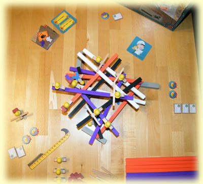 Bei den Bauaufgaben muss äußerst vorsichtig agiert werden, denn schließlich darf kein Material zu Boden stürzen. Egal, ob bereits verbaut oder gerade im Bau befindlich. Tut es dies dennoch, ist der eigene Zug sofort beendet und eins der Sicherheitszertifikate futsch. Der nächste Spieler erhält den Haken und räumt vor seinem Zug erst einmal alles zu Boden gegangene von der Baustelle.