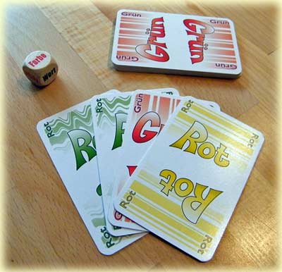 Genau dies transportiert bereits das Spielgefühl. Meine Güte, eine Auswahl von 16 Karten, von denen zwei Karten als passend zu identifizieren und eine davon schneller als die der Mitspieler in die Tischmitte zu bringen ist. Man sollte meinen, diesem Anspruch müssten auch schlichte Gemüter wie meines locker gerecht werden. Und doch verknotet sich das Hirn aufgrund der Beteiligung von Farben.