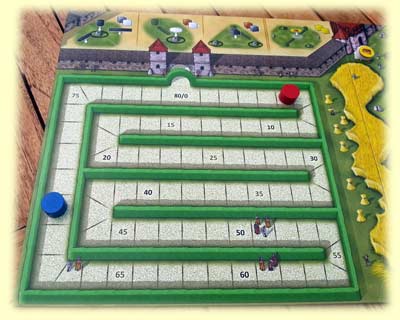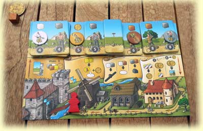 - An der Burg muss zwangsweise angehalten werden. Die Ressourcen sind nun auf maximal drei zu reduzieren. Außerdem muss ein Arbeiter abgedeckt werden, der somit für die Folgerunden nicht mehr zur Verfügung steht.