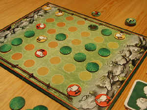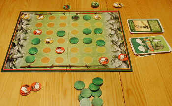 Zwei Spieler suchen unter verdeckten Grasplättchen nach fettem Gras. Doch wehe sie entdecken den Wolf…