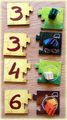 Auf einigen Puzzleteilen sind Ressourcensymbole wie Gold, Biber und Mais abgebildet, diese bringen am Ende Punkte. Darüber hinaus sind auf einigen Puzzleteilen Effekte abgebildet, die dir z.B. Rinder bringen, dir die Möglichkeit geben, Rinder von Mitspielenden zu stehlen oder die am Ende die Wertung deiner Ressourcen erhöhen.