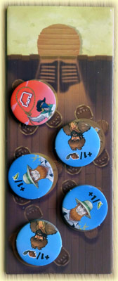 Verbaust du ein Puzzleteilchen, auf dem ein Kreis abgebildet ist, kannst du eine Person aus dem Saloon anheuern. Dies kann z. B. eine Viehdiebin sein, mit der du ein ungeschütztes Rind anderer stehlen darfst. Dieses Rind musst du dann auf das Teil stellen, auf dem deine Viehdiebin steht. Es gibt auch Puzzleteile, auf denen ein Rind und ein Kreis abgebildet ist, d.h. du darfst hier zusätzlich ein Rind aus dem Vorrat nehmen und dort hinstellen. In diesen Kreis lohnt es sich jetzt aber nicht, eine Viehdiebin zu stellen, da du sonst 2 Rinder auf dem Teil stehen hast. Von denen müsstest du eins mit Hilfe eines Cowboys wegbewegen, den du auch im Saloon anheuern kannst, wenn du erneut ein Teil mit Kreis verbaust. Auch lohnt keine Viehdiebin, wenn alle anderen keine ungeschützten Rinder haben. Es gibt also so manches zu bedenken beim Ranch-Ausbau, auch wenn sich Moon River flott und locker von der Hand spielt.