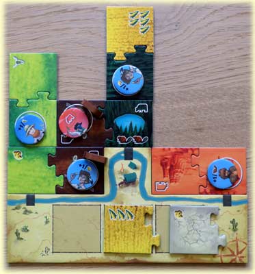 Auf der Rückseite der Puzzleteile befindet sich eine Zahl von 1 bis 6. Beim Spielen werden vier Puzzleteile zunächst mit den Zahlen nach oben auf den Tisch gelegt und nach Wertigkeit sortiert und dann auf die Landschaftsseite umgedreht. Zu Beginn platzieren alle nun in ausgeloster Reihenfolge ihre Rancherfigur auf ein Teil. Dann werden erneut vier Teile ausgelegt, nach Wertigkeit sortiert und umgedreht. Wer seinen Rancher auf das Teil mit der niedrigsten Zahl gestellt hat, beginnt nun immer bei der neuen Auswahl. Bist du an der Reihe, nimmst du das Puzzleteil mit deinem Rancher in deinen Vorrat und stellst deinen Rancher auf ein beliebiges Teil der neuen Reihe. Hast du mindestens zwei Puzzleteile im Vorrat, kannst du sie zu einem Dominostein zusammensetzen und mit dem Ausbau deiner Ranche beginnen. Liegen bereits drei Puzzleteile in deinem Vorrat und nimmst du ein viertes Puzzleteil, musst du sofort einen Dominostein zusammensetzen und bauen.