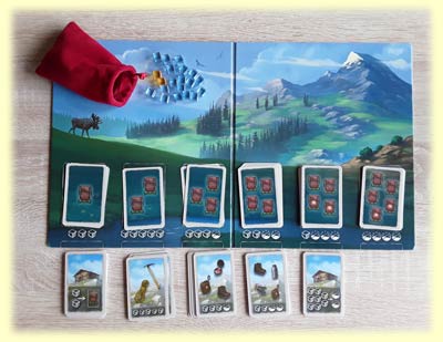 In die Tischmitte wird der Bergplan mit den Tourenkarten (sortiert nach Schwierigkeitsgraden) gelegt, ebenso der Stempel und das Stempelkissen. Außerdem erhält jeder Spieler ein Gipfelheft sowie Ausrüstungskarten und acht Gefälligkeitssteine.