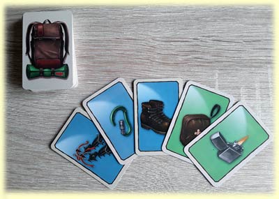 Welches Symbol man sammelt, kann man sich hier allerdings nicht selbst aussuchen, sondern das gibt die gewählte Tour vor. Sehr wohl kann man stattdessen jedoch den Schwierigkeitsgrad bestimmen, der vorgibt, wie viele Ausrüstungsgegenstände man benötigt, um eine Belohnung zu kassieren. Risiko zahlt sich aber aus, denn je höher der Schwierigkeitsgrad, desto besser auch die Belohnung. Wie bei Quartett ist es aber auch hier so, dass man zwar erst einmal gut vorwärts kommt, wenn man viel Passendes selbst auf der Hand hat, trotzdem sehen beim Aufdecken der Karten zum Erfüllen einer Tour die Mitspieler aber auch, über welche Ausrüstungsgegenstände man verfügt. Das macht es ihnen in ihren Zügen natürlich auch leichter, gezielt bei den Mitspielern Gegenstände auszuleihen.