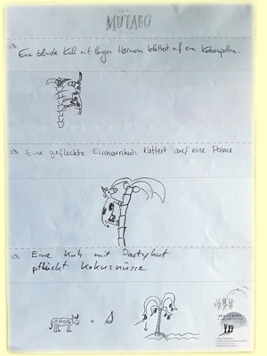Schräge Sätze werden aufgeschrieben und dann – wie bei Stille Post – an den nächsten Spieler weitergegeben. Dieser muss versuchen, das Niedergeschriebene zu zeichnen usw. Am Ende amüsiert man sich gemeinsam über den lustigen Verlauf, den diese Geschichten zuweilen nehmen.