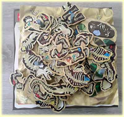 Mixosaurus ist relativ schnell aufgebaut. Zunächst werden alle Skelettteile in den Schachteldeckel gepackt, anschließend wird eines der zuvor zerknüllten und dann wieder etwas geglätteten Papier-Spielfelder auf die Knochenteile gelegt und das Schachtelunterteil verkehrtherum in den Deckel geschoben. Die Schachtel wird nun umgedreht und der Deckel wieder entfernt, sodass alle Teile oben auf dem Schachtelboden wie auf einer Art Podest liegen. Nun werden noch an vier Stellen je nach gewünschtem Schwierigkeitsgrad zwei beziehungsweise drei Felssteinchen als Felssockel auf den Fossilienteilen aufgestapelt.