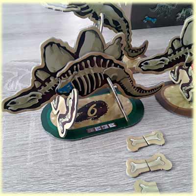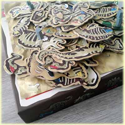 Hatte die Ausgrabung Erfolg, kann es zur zweiten Aktion kommen, der Präparation. Für ein fertiges Skelett werden immer vier Teile benötigt: Zwei Beinpaare, ein Schädel und ein Schwanzteil. Bestenfalls tragen sie alle ein Bändchen in derselben Farbe und gehören zum Dino einer Art, anderenfalls fügt sich der Dino aus verschiedenen Arten zusammen, sodass ein „Mixosaurus“ entsteht, welcher anstatt 10 immerhin noch 6 Punkte erzielt.