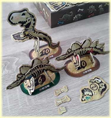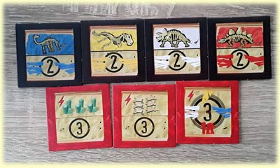 Des Weiteren müssen noch drei von sieben Auftragsplättchen gezogen werden, deren Erfüllung am Ende zusätzliche Punkte einbringt. Bevor es losgehen kann, erhält jeder Spieler noch zwei Knochenmarker, während die übrigen Marker und die fünf zu vergebenen Ausstellungsplättchen für vollendete Dinos in den Vorrat gelegt werden.
