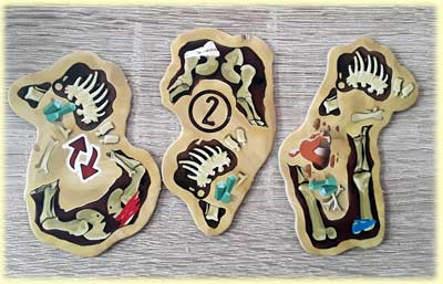 Neben den „regulären“ Skelettteilen mit farbigem Band gibt es zusätzlich noch Knochen, auf denen sich eins von vier verschiedenen Ereignissen befinden kann. Hier muss dann entweder eine weitere Ausgrabung ausgeführt werden, eins der eigenen Fossilienteile muss mit einem Mitspieler getauscht werden, alle Mitspieler müssen einen ihrer Knochenmarker an den aktiven Spieler abgeben oder das jeweilige Teil gibt am Ende zwei Extrapunkte. Im Gegensatz zu den anderen Skelettteilen können diese Teile jedoch nicht zur Präparation verwendet werden.