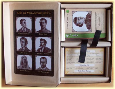 Die wunderschöne Aufmachung der Spielbox hat mich dazu angeregt, dieses Spiel zu kaufen. Eine Seitenkante sieht aus wie der Rücken eines alten, in Leder gebundenen Buches und hat etwa Taschenbuchgröße. Nach dem Öffnen des Klappdeckels wird man ebenfalls nicht enttäuscht. Eingebettet in einen Kartonrahmen, der ein wenig an einen Samteinsatz erinnert, liegen die Karten auf zwei Samtbändern, mit deren Hilfe man die Spielkarten leicht der Schachtel entnehmen kann. Die Karten selbst sind mit Farbbalken und stimmungsvollen Schwarz-Weiß-Grafiken versehen.