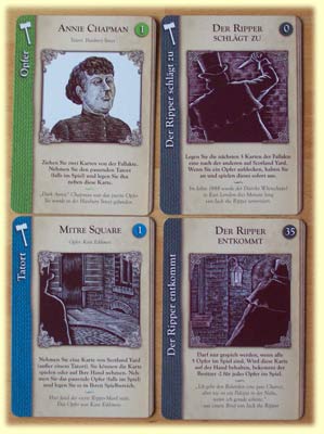 Durch die Karte "Der Ripper entkommt" wurde in meinen Spielen nur eine einzige Runde beendet. Und dies auch nur deshalb, weil ich mir in Gedanken immer wieder vorsagte, speziell auf diese Möglichkeit zu achten. Nach unzähligen Runden, in denen die Karte nicht spielbar war, weil nicht alle fünf Opfer auslagen, vergisst man mit der Zeit einfach auf diese Alternative, die nicht nur eine Menge Punkte bringt, sondern vor allem auch einen enormen Vorteil gegenüber den Mitspielern, die in solchen Runden meistens ziemlich leer ausgehen. Andererseits kann man auch Minuspunkte kassieren, wenn man diese Sonderkarte am Schluss noch auf der Hand hält.
