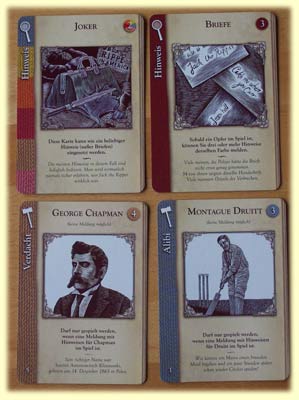 Spieltechnisch gibt es an den Karten leider zu bemängeln, dass mit dunkelrot, rot, rosé und dunkelorange Farben gewählt wurden, die bei künstlichem Licht nicht leicht zu unterscheiden sind, wenn man sie nicht zufällig nebeneinander in der Hand hält. Zwar sind die Karten auch mit den Täternamen versehen, aber diese sieht man leider nicht, wenn man die Karten normal gefächert hält. Positiv ist wiederum zu erwähnen, dass hinsichtlich der vielen Sonderregeln zu den einzelnen Kartentypen der Kurztext am unteren Kartenrand sehr hilfreich ist. Hier kann man anfangs immer wieder nachsehen, was die einzelnen Karten bewirken. Einfacher wäre zwar eine Zusammenfassung dieser Sonderfunktionen auf den Übersichtskarten gewesen, welche lediglich die Aufzählung der vorhandenen Karten enthält, weil man dazu die Karten nicht aus der Fächerformation ziehen müsste. Aber aus irgendeinem Grund kam der Verlag nicht auf diese Idee.