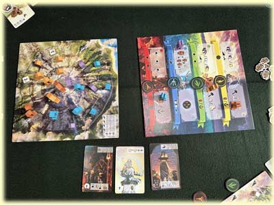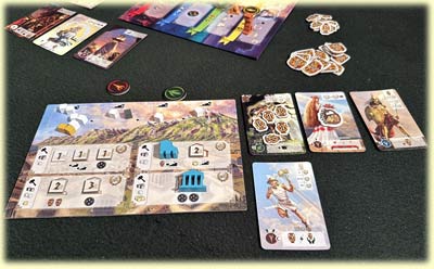Jeder Spieler beginnt mit einer Götterkarte, entweder zufällig oder aus 2 Karten ausgewählt. Weitere liegen verdeckt aus, bis auf eine offene, auf den verdeckten liegen Sperrmarker mit aufsteigenden Werten. Alle Götterkarten haben spezielle Funktionen und Fähigkeiten – alle sind gut in der Regel erklärt, die Symbolik ist teilweise etwas gewöhnungsbedürftig, aber man gewöhnt sich schnell.