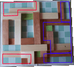 Dann erfolgt die Wertung: Es werden die abgegrenzten nicht bedeckten Spielbrettfelder (je Feld 1 Punkt) für jeden Spieler gezählt. Der Spielbrettrand zählt auch als Grenze. Im Bild hat der Spieler mit den hellen Stegen 9 Punkte (rot markiert) erzielt, der Spieler mit den dunklen Stegen dagegen 16 (blau markiert).
