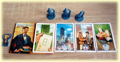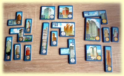 Außerdem will auch noch der Einsatz der eigenen Spezialkarten wohl überlegt sein. Davon erhält man zu Spielbeginn drei Stück. Sie erlauben das Austauschen der Bauplatzkarten, den Erwerb von zwei statt einer Bauplatzkarte oder den Bau eines zweiten Hochhauses in einem Spielzug.