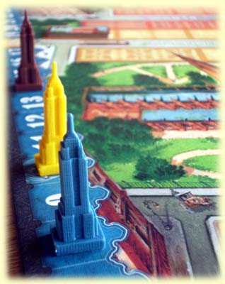 Einmal im pro Spiel kann man übrigens auch einen so genannten legendären Wolkenkratzer bauen, von denen es vier verschiedene gibt und die im Vergleich zu den eigenen Gebäude mehr Siegpunkte bringen, für die man aber auch vier bis fünf zusammenhängende Bauplätze benötigt.