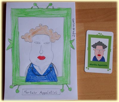 Am schwierigsten ist der Rahmen. Seine grobe Form ist zwar zusammen mit der Kopfform als Schablone vorhanden, jedoch gibt es die meisten seiner Verzierungen (und davon hat er immerhin drei verschiedene, nämlich oben, unten und seitlich) nicht auf Schablone, sondern man muss sie frei aus dem Gedächtnis nachzeichnen. Hier stößt man auch gleichzeitig auf den ersten Schwachpunkt des Spiels: Kinder empfinden es teilweise als ungerecht, dass manche Rahmenverzierungen auf Schablonen vorhanden sind und manche nicht. Eine dreizehnte Schablone mit Rahmenteilen wäre den Verlag bestimmt nicht zu teuer gekommen und hätte in dieser Hinsicht für Chancengleichheit gesorgt.