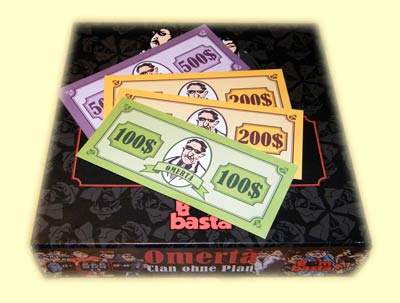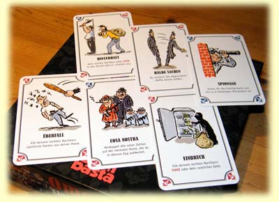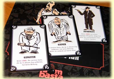 Doch womit genau werden wir hier von diesen jungen aufstrebenden Bremern beglückt? Zunächst mit einer gerade noch handgepäckverträglichen Kleinschachtel, die innen großzügigen Stauraum für Karten, Spielgeld und Regelheft lässt. Offen gestanden so großzügigen Spielraum, dass die Karten gerne etwas größer hätten ausfallen dürfen. Insbesondere der entscheidende Anweisungstext, was genau durch diese Karte ausgelöst wird, lässt die Hoffnung auf ein gedimmtes Mafiaambiente schon vor Spielbeginn sterben. Nun bedeuten größere Karten vermutlich höhere Produktionskosten, was das Verständnis für den diesbezüglich regressiven Stil erhöhen sollte. Zumindest, wenn es sich beim Herausgeber um ein Kleinunternehmen und Neuling handelt. Vielleicht dann doch noch der Hinweis, beim nächsten Mal ggf. der Kartengrafik einen geringeren Raum oder eine Hintergrundrolle zuzuweisen und dafür derart kriegsentscheidende Worte entsprechend größer abzubilden. Dann können auch in Ehren ergraute große Dons noch unbeschwert mitspielen.
