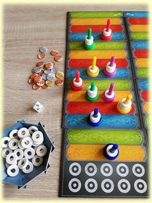 Etwas mühselig ist der permanente Verwaltungsaufwand mit den Scheiben. Am besten bestimmt man anfangs einen Spieler, der das Aufstecken der Ringe übernimmt, wenn Figuren überholt werden. Sonst wird es leicht vergessen. Das Spielmaterial ist bunt und zweckdienlich, allerdings nervt der Behälter zum Aufbewahren der Ringe, weil er öfter mal auseinanderfällt. Ein Schüsselchen tut hier sicher bessere Dienste.