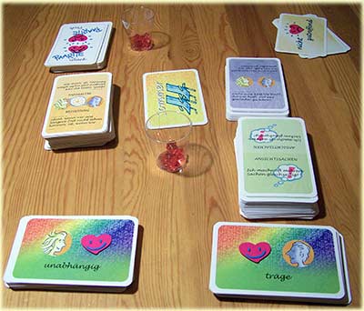 Sind die Übereinstimmungen in diesen Kartengruppen meist leicht zu erzielen, so können die Partner bei den Zuordnung der Eigenschaftskarten eher daneben liegen, bei denen es zwei Diamanten bei völliger Übereinstimmung gibt, die aus den übrig gebliebenen 21 Stimmungsbarometer-Karten ausgewählt werden müssen. Da dürfen sich beide zum Beispiel auf die Suche nach der Eigenschaft begeben, die ihnen hilft, gesünder zu leben oder die Ratlosigkeit überwindet. Recht spannend sind die "Glück/Pech"-Karten, für die es zwar keine Diamanten gibt, die aber den Partner in Zugzwang bringen oder eigene Anforderungen bedeuten - Versprechen, die eingelöst werden müssen. Da springt schon einmal das Frühstück im Bett heraus, kann aber auch der Konzertbesuch, zu dem man vielleicht gar keine Lust hatte.