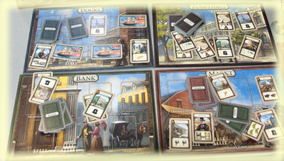 Pro Ort gibt es 38 bis 42 Karten. In jedem Stapel sind Gebäude zu finden, die gegen die Zahlung von Dollar Siegpunkte verheißen. Das notwendige Geld muss sich der Spieler mit der Erfüllung von Aufträgen verdienen. Um einen Auftrag zu erfüllen, benötigt der Spieler den Auftrag, die Anzahl der darauf abgebildeten Rohstoffe sowie ein Handelsschiff des Landes.
