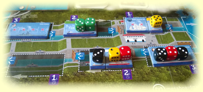 Eine 1 bis 3 erlaubt mir, ein bis drei Schleusenbewegungen sowie, je nach Lage des Würfels innerhalb seiner Reihe, 1 bis 3 Schiffsbewegungen. Diese Bewegungen sind ein besonderes Moment im Spiel, weswegen ich das hier etwas genauer erläutern will: