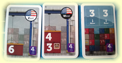 Nehme ich einen Würfel mit 4 bis 6 Punkten, darf ich mir die danebenliegende Auftragskarte nehmen und habe, je nach Position des Würfels in seiner Spalte, 1 bis 3 Verladeaktionen. Mit den Verladeaktionen kann ich von den Auftragskarten Container auf Schiffe in den Hafen verladen, zu dem die Auftragskarte gehört. Dabei kann ich eigene und/oder fremde Schiffe beladen, wie es gerade passt.