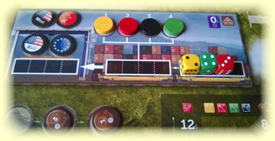 Ein weiteres Problem ist für mich die Frage der Varianz im Spiel. Abgesehen von der Aktionsverteilung durch die Würfel hat sich bei mir nie das Gefühl eingestellt, beim nächsten Spiel eine andere Strategie verfolgen zu wollen. In meinen wenigen Zügen versuche ich immer möglichst viele Container aufzuladen und meinen Transport so zu optimieren, dass ich möglichst oft von den Aktionen meiner Mitspieler profitiere. Das ist zwar jede Partie ein klein wenig anders, aber inhaltlich ändert sich nur sehr wenig.