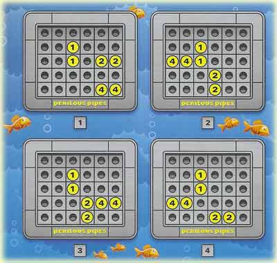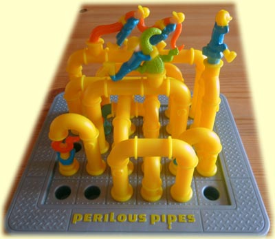 Perilous Pipes besteht aus 15 nummerierten Rohrteilen. Jedes davon hat die Form eines auf dem Kopf stehenden "U"s in unterschiedlichen Längen und Höhen. Aus dem Heft wird eine Aufgabe gewählt und die abgebildeten Rohrteile wie beschrieben platziert. Anschließend müssen die übrigen freien Löcher auf dem Spielbrett mit den restlichen Rohren so gefüllt werden, dass kein Teil übrig bleibt.