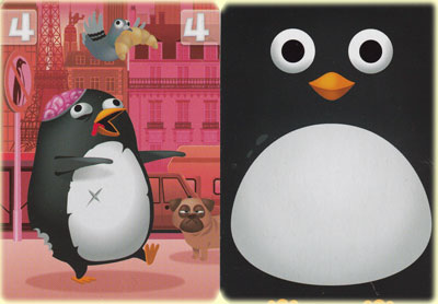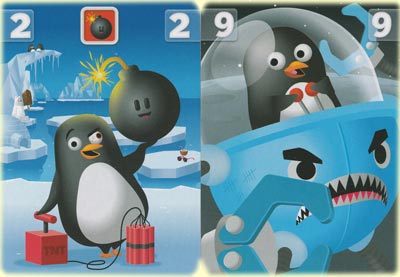 Der stets gleiche Spielablauf wird durch die Spezialkarten gewürzt, von denen es drei gibt: Der Kamikaze-Pinguin zerstört alle Karten mit den Werten 7, 8 oder 9, wenn sie gleichzeitig mit ihm in die Auslagen gelegt werden. Spielt man die Ninjazwillinge aus, so muss man im nächsten Zug zwei statt einer Handkarte ablegen. Diese Karte für die vorletzte Runde aufzuheben macht besonders viel Sinn, weil man dann noch reagieren kann, falls man zur hart aufgesparten Einzel-Neun (die ja dann die niedrigste Karte einer Farbe ist und somit satte neun Punkte bringen würde) noch irgendeine niedrige Karte derselben Farbe dazu bekommt, diese aber nicht ausspielen kann oder will, weil man eigentlich andere Pläne hatte. Mit den Ninjazwillingen könnte man dann diese unliebsame Karte zusammen mit der eigentlich geplanten ausspielen und wäre sie somit wieder los. Ebenso hilfreich ist der Aufklärer-Pinguin. Er ermöglicht es nämlich, in der nächsten Runde erst einmal abzuwarten, was die anderen ausspielen, bevor man sich selbst entscheiden muss. Alle drei Sonderfähigkeiten befinden sich auf den Karten mit den Werten von 1 bis 3, so dass auch die niedrigen Kartenwerte an Bedeutung gewinnen.