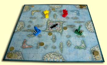Der Spielplan zeigt die Inselwelt und die vier Heimatbuchten der Spieler. Dort beginnen sie mit ihren Schiffen. Die Spielplanfelder zeigen einige Inseln, Felder mit Fragezeichen und Schatzfeldern, auf denen verdeckt die Gold-Dukaten abgelegt werden. In der Mitte des Plans ist der Windanzeiger.