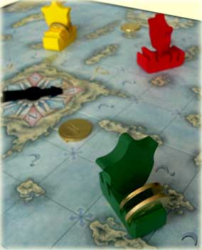 Der Zugmechanismus ist ganz nett, hängt aber sehr von den Würfelergebnissen ab. Wem der Würfel nicht hold ist, der kann sich noch mit den Aktionskarten Hoffnung machen. Die Aktionskarten können jedes Würfelergebnis verändern - andere Windrichtung oder Zugweite - vorausgesetzt, man erhält die passende Karte. Also hängen auch das belebende Element der Karten und die dadurch resultierenden Möglichkeiten stark vom Kartenglück ab. Glücklich schätzen kann sich zudem, wer beim Einsammeln der Dukaten 2er oder 3er Werte entdeckt.