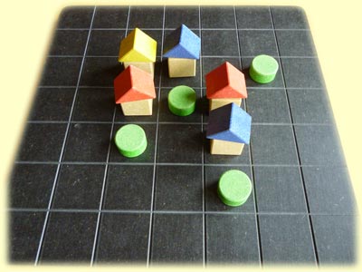 Der Spielplan wird in die Tischmitte gelegt, und jeder Spieler erhält die Dächer einer Farbe.