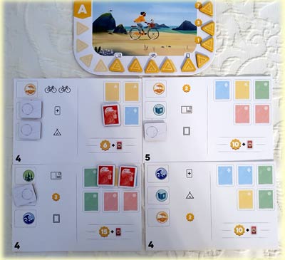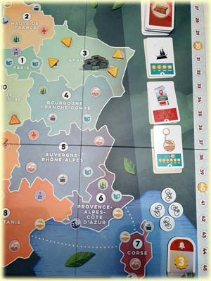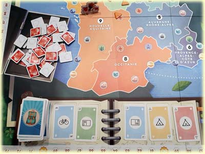 28.02.26 von Roland Winner - Grafisch sehr ansprechend bearbeitete Postkarten (originale Karten-Größe) von Orten und Attraktionen in Frankreich sind das Hauptmerkmal des Spiels. Du reist durch das Land und besuchst Attraktionen, wo du dein Lager (Camp) aufschlägst. Dabei erwirbst du einige Postkarten, ggf. passend zu deiner Route. Für das Bauen eines Lagers musst du in der Region von einer deiner Postkarten sein (z.B. die 1 für den Großraum Paris, 13 für die Normandie) und auf der Landkarte dort eins von mehreren Lager-Symbolen vorfinden. Durch Abdeckung des Symbols steht dir ein Bonus auf irgendeiner deiner Postkarten zu, wenn dort auf der Beschriftungsseite das abgedeckte Symbol auftaucht. Eine der Aktionsarten erlaubt es, 1 Briefmarke auf eine deiner Postkarten zu "kleben", die je 3 bis 6 Marken brauchen. Voll beklebt, darfst du eine solche Karte verschicken, was 3 bis 15 Punkte bringt. Sobald jemand 4 Karten versandt hat, läuft die letzte Runde. Zusätzlich gibt es Belohnungen und Zielkarten für weitere Punkte. --- Postcards spielt sich mit wenigen Regeln gut als Familienspiel und lebt vor allem von den Gesprächen über die auftauchenden Namen von bekannten Orten und Speisen auf neu ausliegenden Postkarten. Postcards ist sehr reizvoll für Frankreich-Kenner und -Fans. |