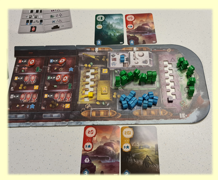 Obwohl alle Spieler permanent in das Spielgeschehen eingebunden sind, kann die Spieldauer über 12 Spielrunden schon mal lange wirken, wenn man nacheinander die Aktionen durchzugeht. Dennoch empfehle ich - speziell zu Beginn - nacheinander und gemeinsam auszuwerten, um mögliche Fehler zu vermeiden und auch mehr von den Aktivitäten der anderen Spieler mitzubekommen. Deutlich schneller geht es dann, wenn alle Spieler parallel auch ihre Aktionen ausführen. Das hat jedoch den Nachteil, dass man nur noch begrenzt mitbekommt, was die anderen Spieler tun und dann wird es auch schwierig zu entscheiden, welche Karten man nach links oder rechts schieben soll. Lediglich im kooperativen Modus kann das gut funktionieren, wenn man sich in der Entscheidungsphase gut abstimmt.