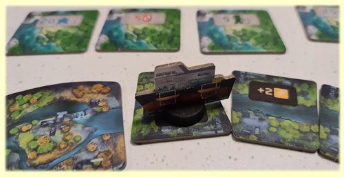 Zu guter Letzt fährt das Schiff auf dem Fluss ein Feld weiter und die Flusskarte wird umgedreht. In der ersten Jahreszeit bekommt man noch zusätzlich einen Bonus, in den beiden anderen Jahreszeiten hingegen muss man etwas abgeben. Wer das nicht möchte, kann alternativ einen Ymune aus dem Bug-Bereich abgeben.