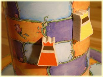 · Eines von drei Farbsymbolen: Man zieht den Prinzen auf ein angrenzendes Feld dieser Farbe (dies kann auch den Turm hinauf sein). Steht man auf der gewürfelten Farbe, darf man noch einmal würfeln