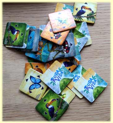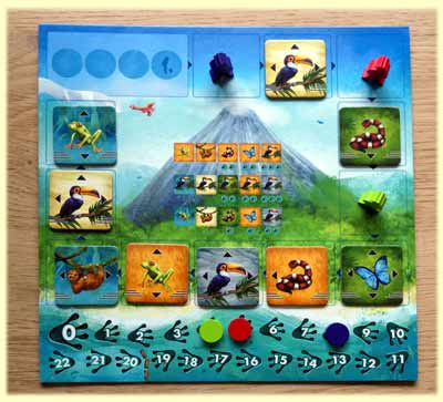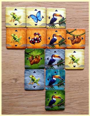 Neues, pfiffiges Element ist allerdings, dass die auf den Plättchen abgebildeten Pfeile vorgeben, aus welcher Richtung sie von außen in die Auslage gelegt werden müssen. So sind beispielsweise Schmetterlinge ganz einfach zu integrieren, da sie von links, rechts, oben oder unten gelegt werden können, Tukane aber nur von links, rechts und unten. Ganz heikel wird es bei den Schlangen, denn hier kann eine nur von unten, eine andere nur von rechts, wieder eine andere von links angelegt werden - das ist ein spannender Twist.