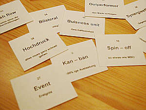 Ein Spieler wird zum Redner ernannt und bekommt den Begriffsstapel bestehend aus 64 Begriffen wie z.B. "Outsourcen", "Management", "Joint-Venture", "Spin-off", "Bilateral" oder "E-Commerce".