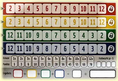 Das Spielprinzip ist allerdings so ähnlich, dass sogar derselbe Wertungsblock verwendet wird wie bei Qwixx. Es geht also darum, in den vier Farbreihen auf seinem Wertungszettel jeweils möglichst viele Zahlen von links nach rechts anzukreuzen. Erst wenn man in einer Reihe mindestens fünf Kreuze hat, darf man auch die letzte Zahl der Reihe ankreuzen und die Reihe damit abschließen. Sobald ein Spieler auf seinem Zettel zwei Farbreihen abgeschlossen hat, endet die Partie. So weit, so (fast) identisch.