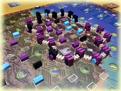 Das Spielfeld ist unterteilt in große Hexfelder, deren Eckpunkte Bauplätze für Gebäude darstellen. In Nachbarschaft dieser Bauplätze befinden sich außerhalb der Stadt Rohstoffe wie Holz, Stein, Silbererz, Oliven, Weintrauben und Fisch. Durch Platzieren eines Gebäudes auf einem dieser Eckfelder erlangen die Spieler Zugang zu diesen Rohstoffen.